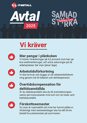 Affischen visar IF Metalls avtalskrav och vad arbetsgivarna vill. Ladda ner, skriv ut och dela till dina arbetskamrater.