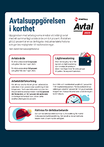Här kan du ladda ner information som i korthet beskriver 2025 års avtalsuppgörelse. Informationen innehåller även en förklaring om hur låglönesatsningen, det så kallade "knät", fungerar. Du kan ladda ner informationen som PDF-fil i A4 eller A3-format, eller som fil för att skicka till tryck. Även då i A4 och A3-format.