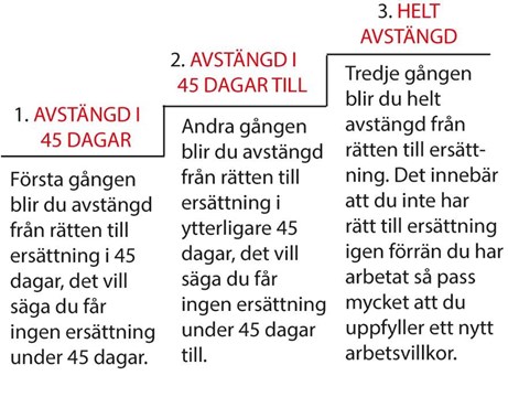 Om du lämnar eller orsakar att du får lämna ett jobb eller ett arbetsmarknadspolitiskt program blir du avstängd från rätten till ersättning i 45 dagar (20 dagar om jobbet eller programmet skulle pågått högst 10 dagar). Detsamma gäller för företagare som upphör med verksamhet som bedömts vara lönsam.