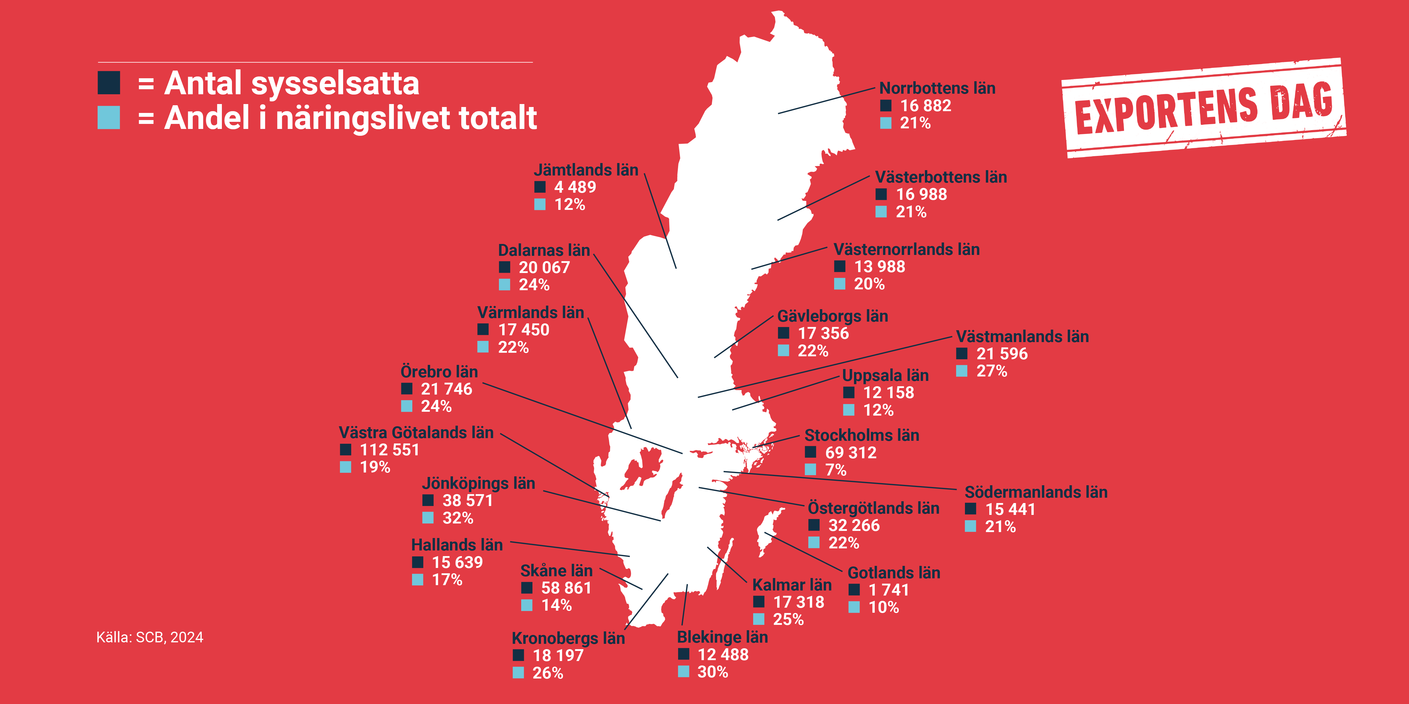 Exporten skapar jobb i hela landet. I såväl mindre bruksorter som på större industriområden i våra storstäder. I nordliga Norrbottens län står industrin för över en femtedel av arbetstillfällena inom näringslivet. I sydliga Jönköpings län är motsvarade andel så mycket som en tredjedel!