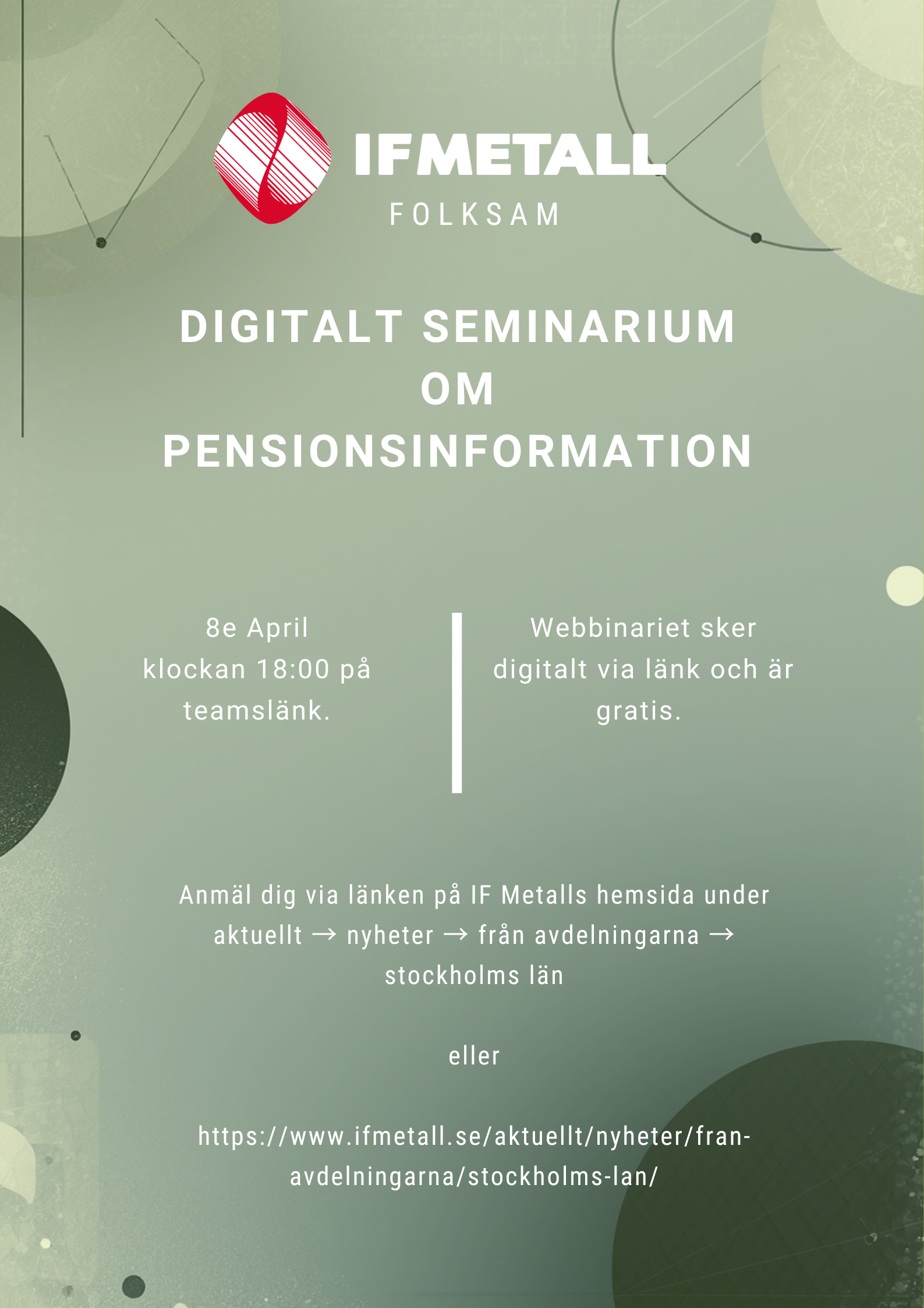Den 8e April sammarbetar vi med Folksam som håller i ett webbinarium om pension där du kan få bra information och ställa dina frågor om hur du kan påverka din pension och vad du behöver göra för att få en så bra och rättvis pension som möjligt. Efter föreläsningen kommer du även få chans att boka upp till en personlig genomgång, där går man igenom hur det ser ut just för dig när det gäller din pension.