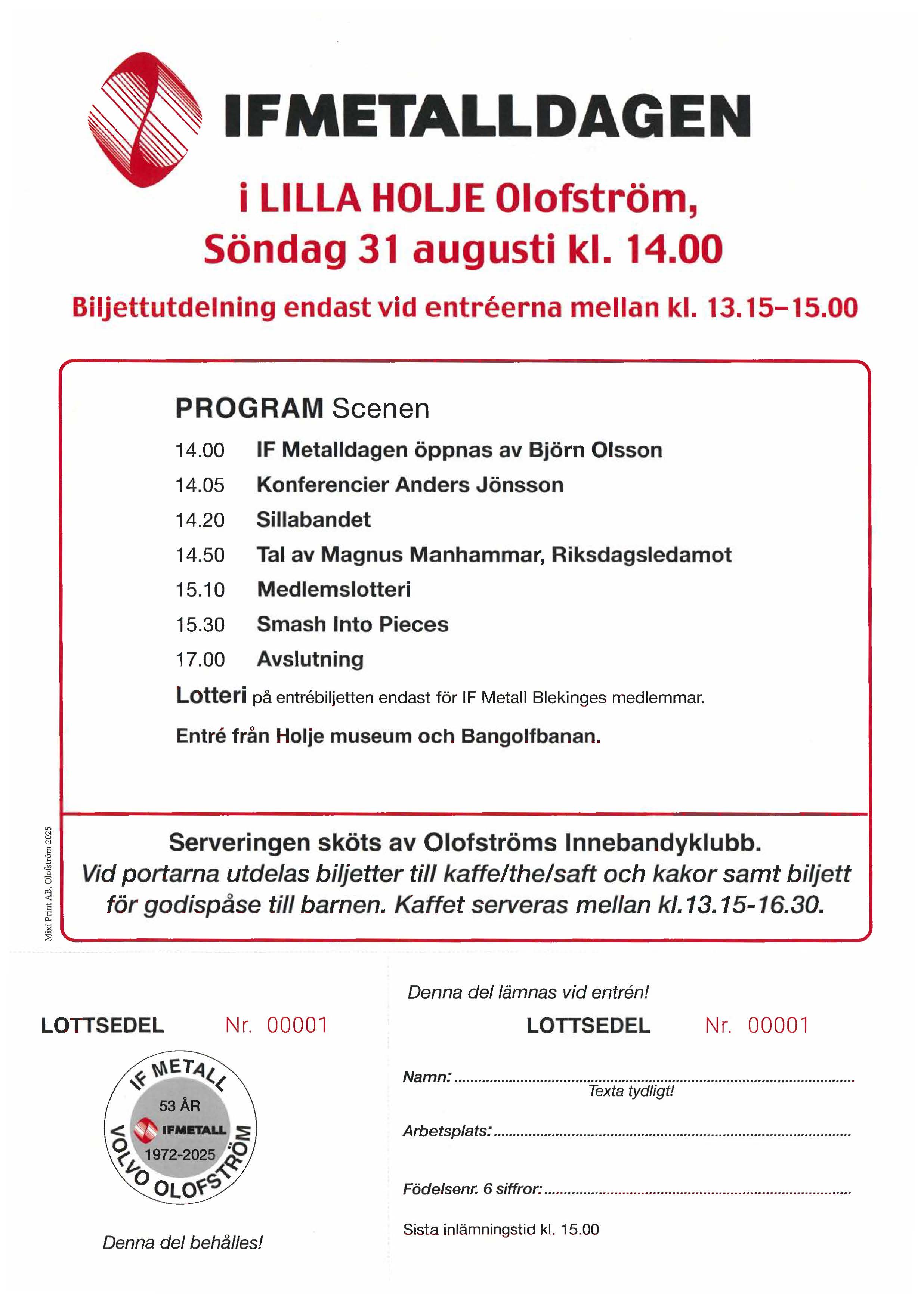 Söndag 31 augusti kl. 14.00 Du är tillsammans med släkt och vänner välkommen till IF Metallklubben Volvo Car Olofström och IF Metall Blekinges familjefest i Lilla Holje park i Olofström.