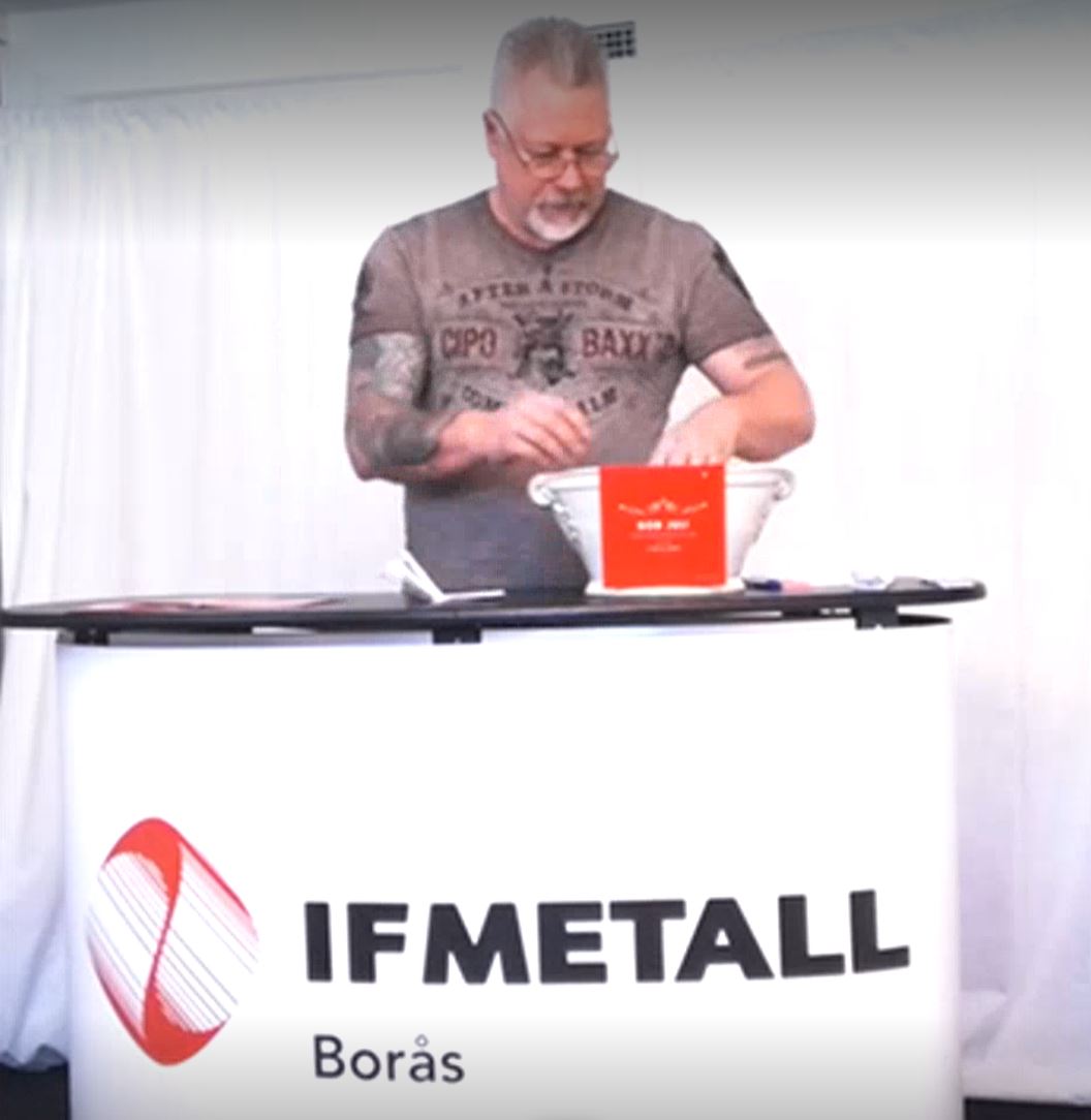 Magnus Persson, ordförande för IF Metall Borås, var den som fick äran att dra vinnarna. Det slutade med att Magnus drog sitt "ordförande-kort" och la till ytterligare tio vinster i kategori andrapris. Det innebär att vi inte fick 20 utan 30 lyckliga vinnare!