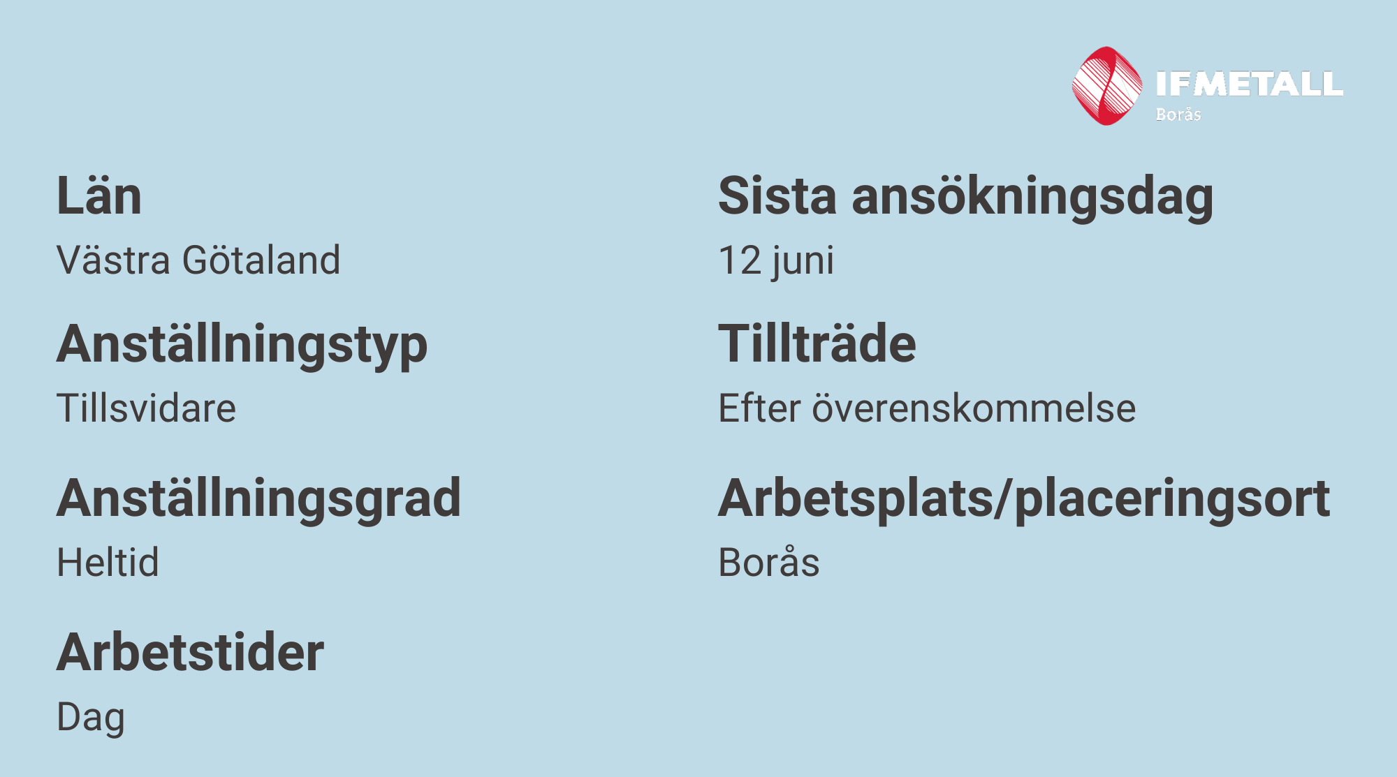 Nu söker IF Metall en lokalombudsman till avdelningen i Borås. Som ombudsman erbjuds du ett meningsfullt och utvecklande arbete där du gör skillnad för avdelningens medlemmar varje dag. Här får du möjlighet att arbeta med engagerade kollegor i en roll där du kommer att ha många kontakter och samarbeten. Tjänsten är en tillsvidareanställning på heltid med tillträde enligt överenskommelse. Välkommen med din ansökan!