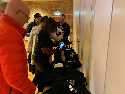 Torgny Ströbeck (Perstorp AB) och Lena Josefsson (Emballator) med flera letar efter en passande storlek på sin t-shirt.