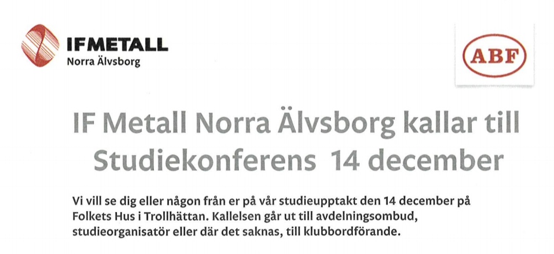 IF Metall Norra Älvsborg kallar till Studiekonferens 14 december
