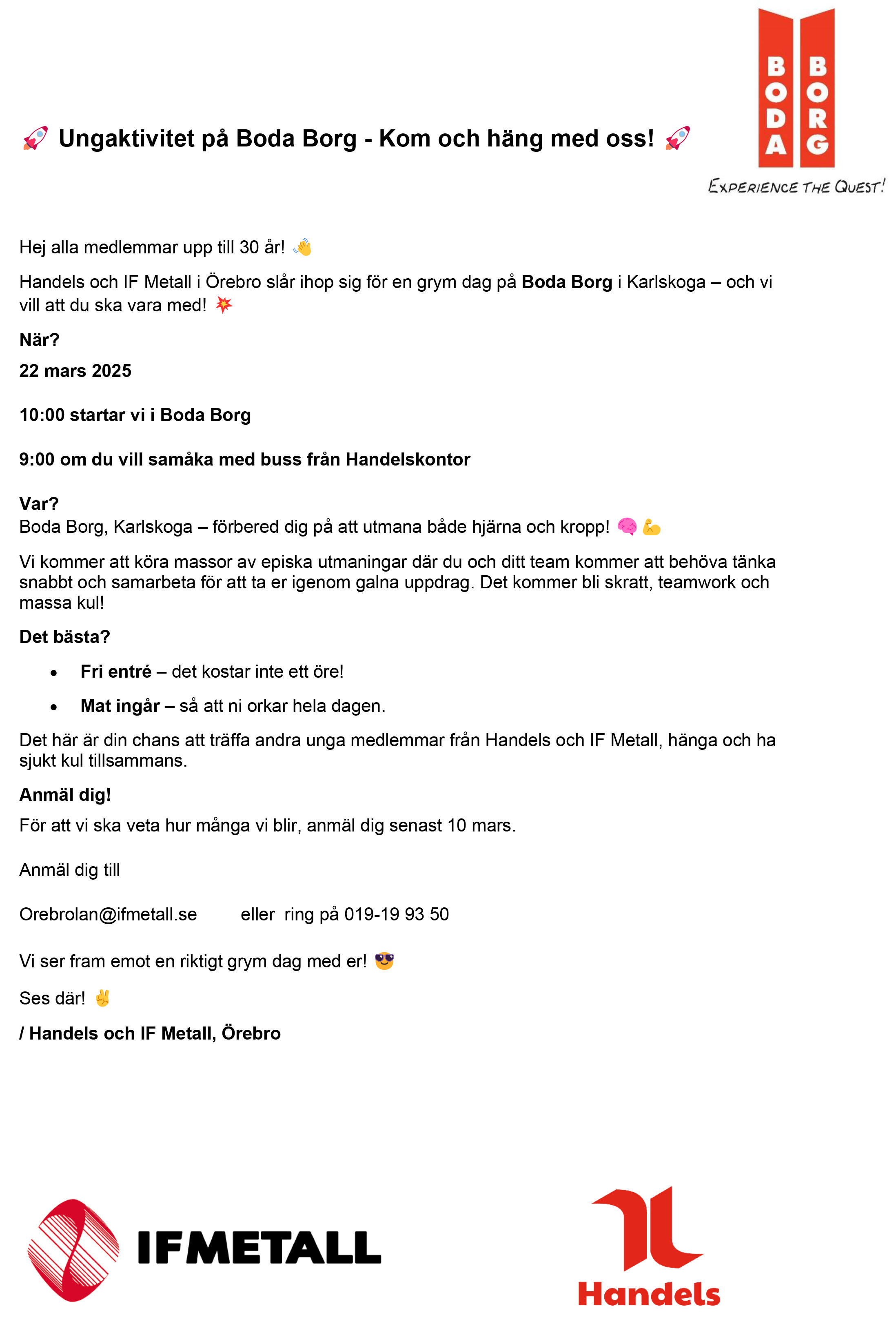 IF Metall Örebro län har tillsammans med Handels ordnat en heldag på Boda Borg i Karlskoga den 22 mars!