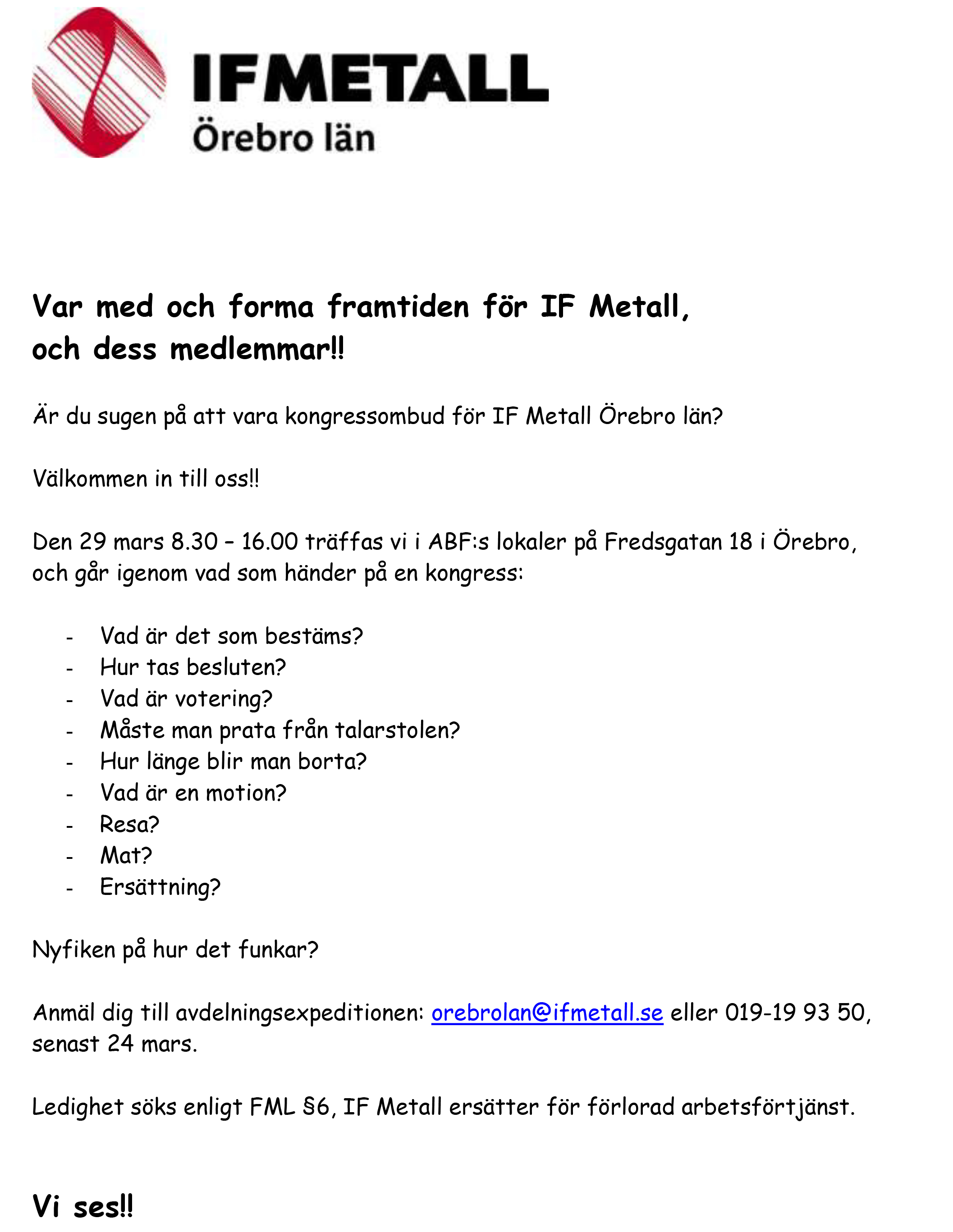 29 mars har IF Metall Örebro län en träff där vi informerar vad det innebär att vara kongressombud.