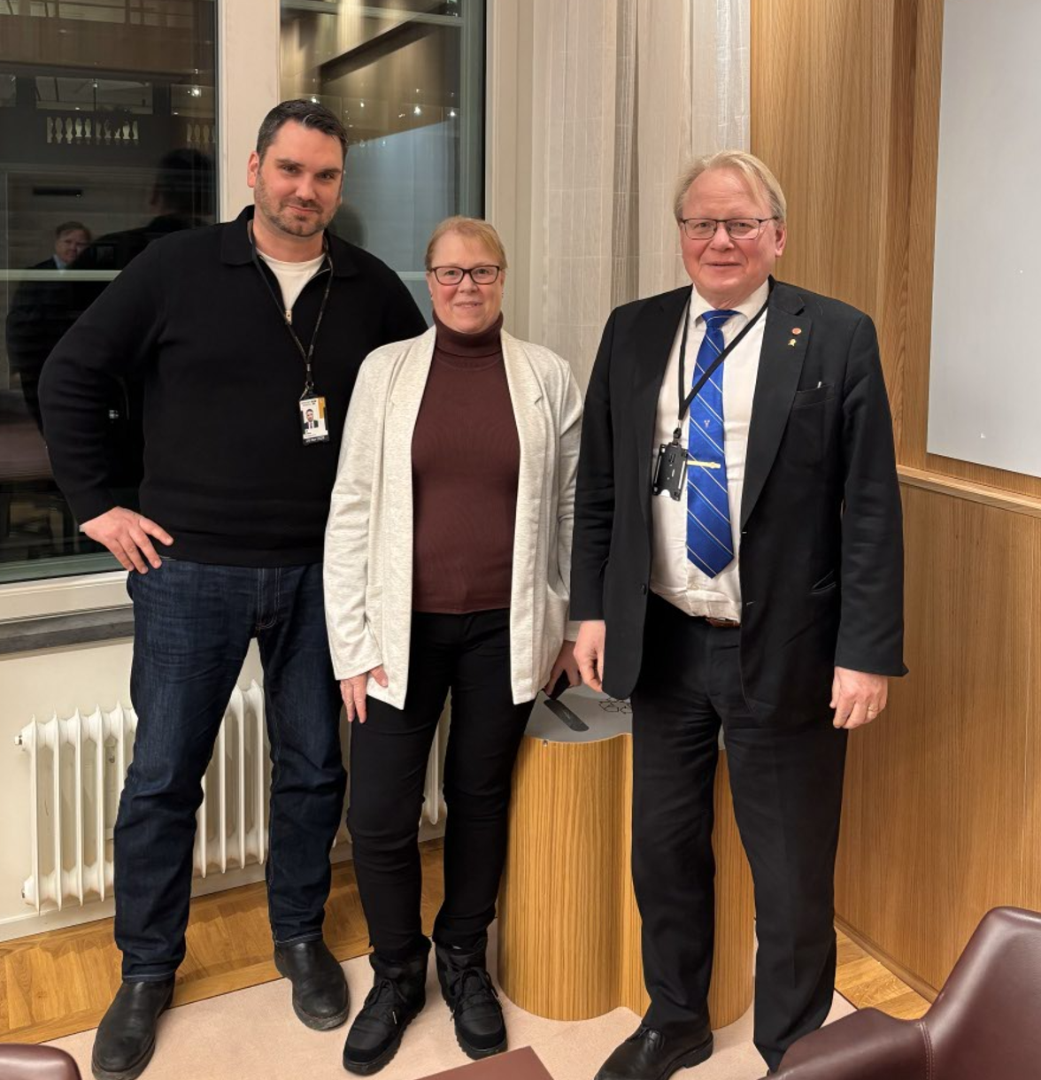 IF Metall har varit på möte med försvarsutskottet. På bilden ser ni från vänster, Erik Ezelius, Elisabeth Karlén och Peter Hultqvist.