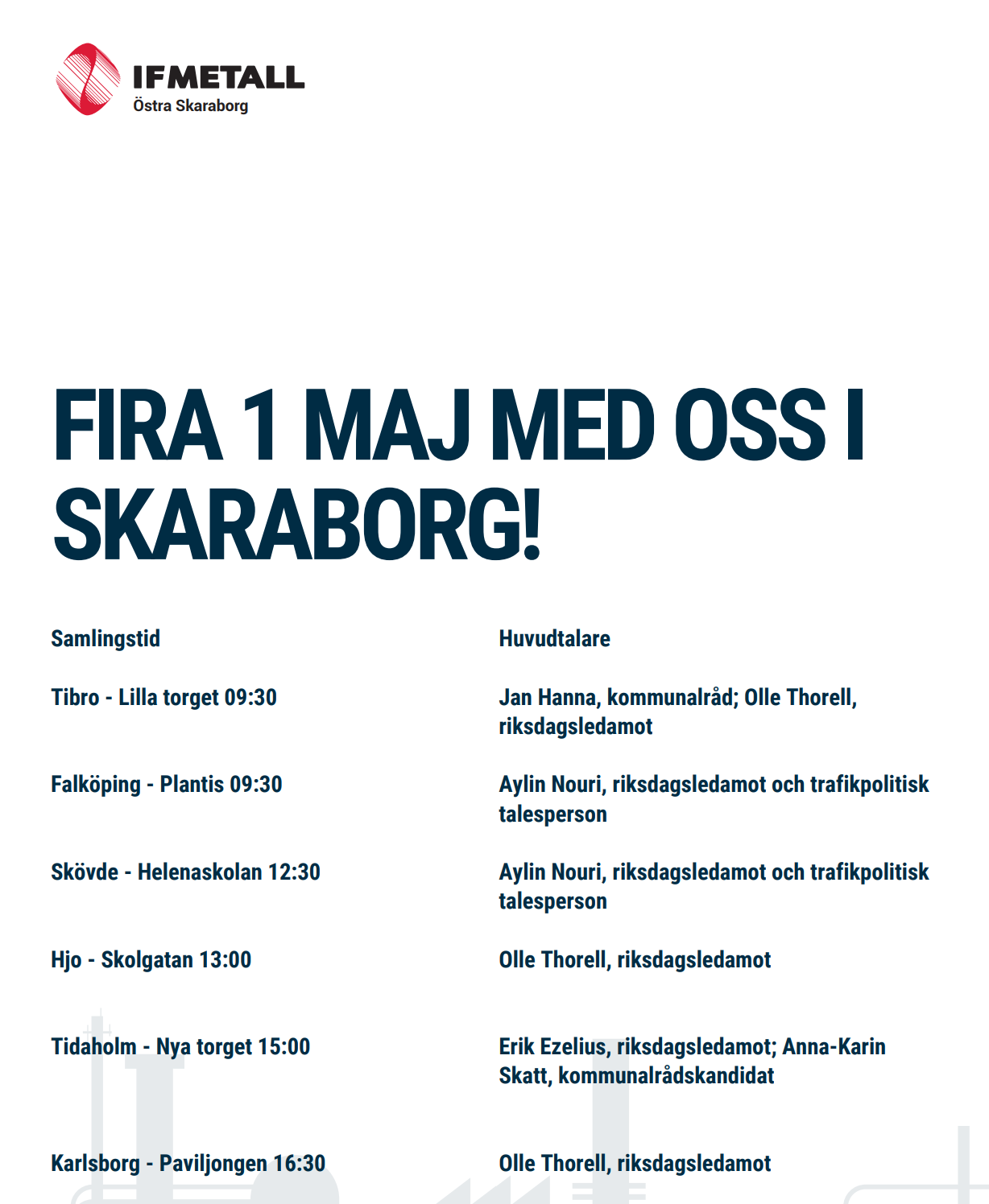 På bilden finns samlingstider runt om i Östra Skaraborg och huvudtalare.
