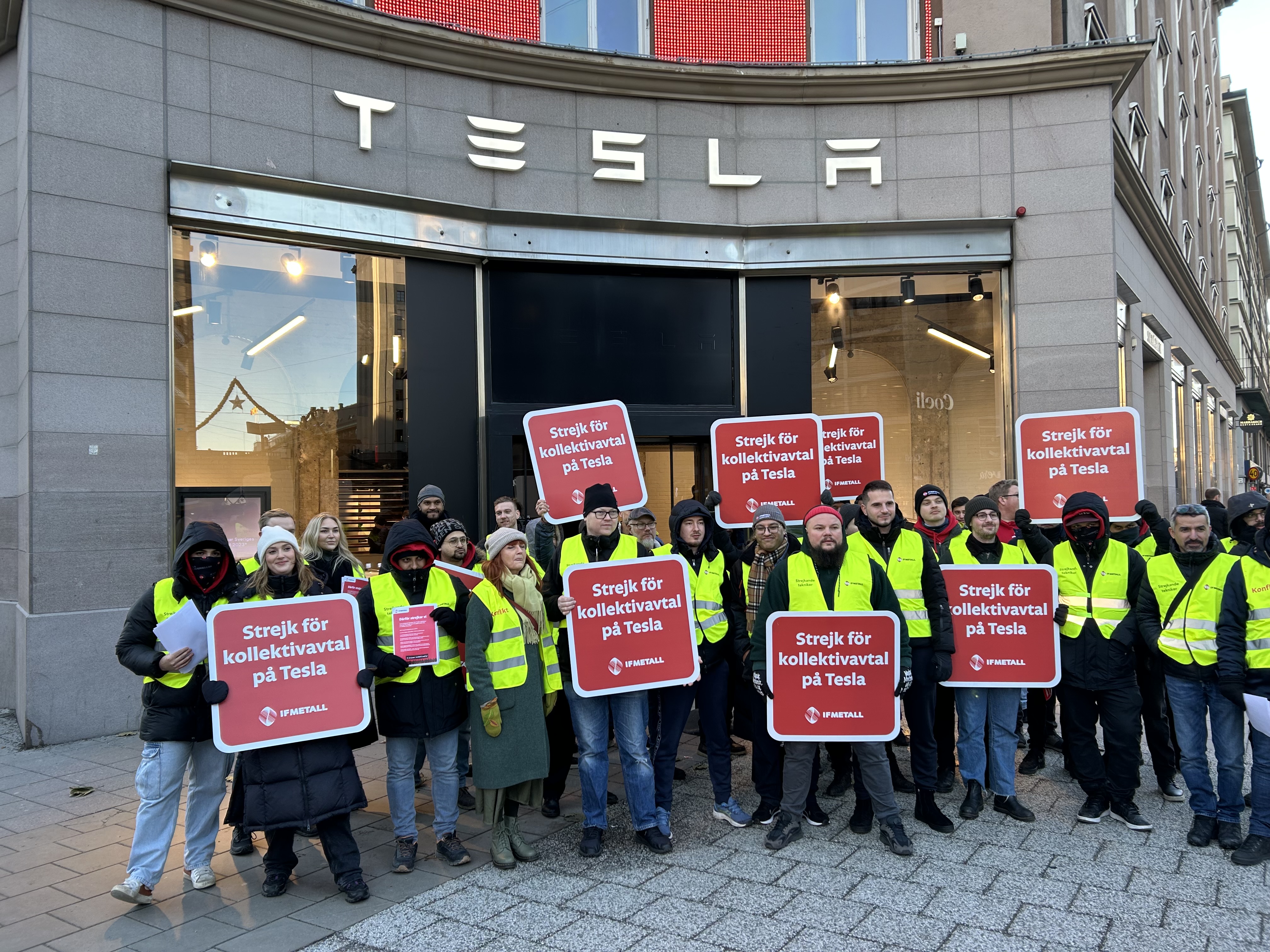 Strejkande på Tesla deltog i dag (16/12) i en manifestation på Sveavägen för tecknandet av kollektivavtal.