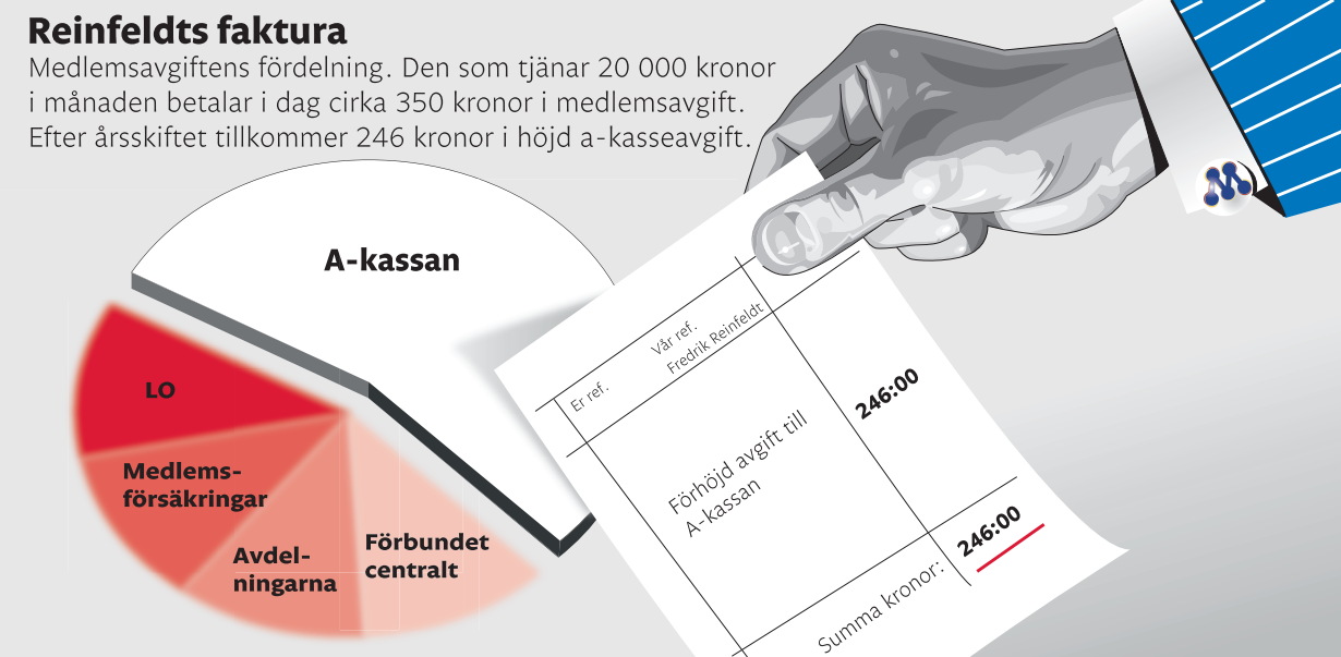 Bild från tidningen Info nummer 1 2007 som illustrerar hur mycket dyrare det blev att vara med i a-kassan efter högerregeringens chockhöjning.