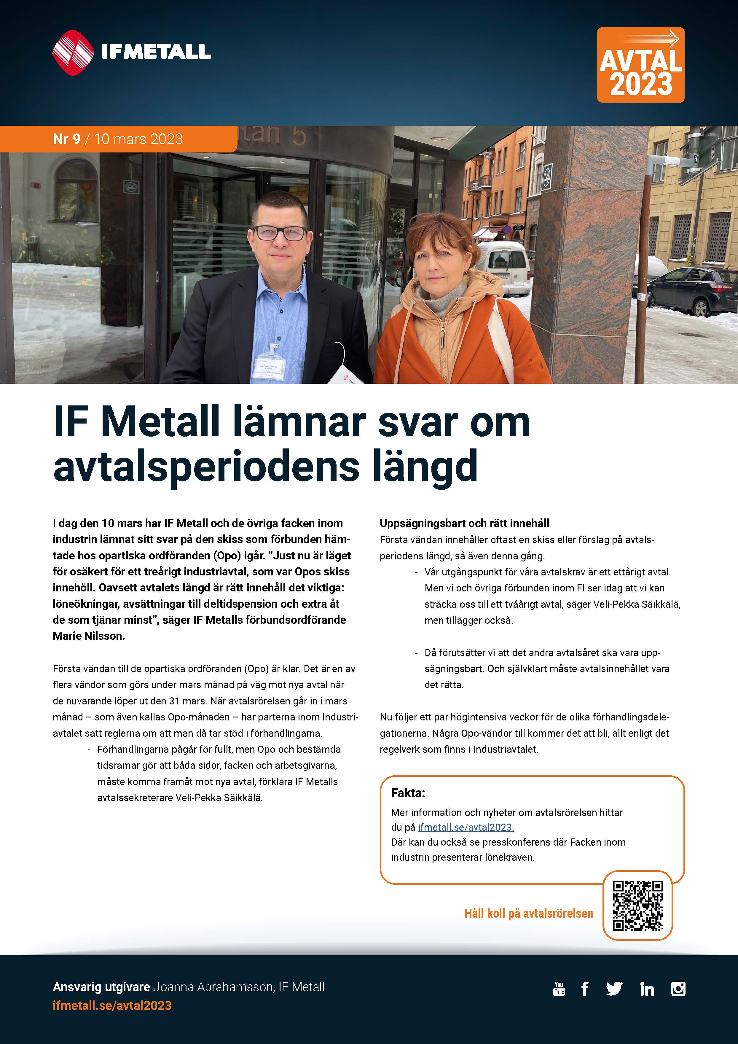 I dag den 10 mars har IF Metall och de övriga facken inom industrin lämnat sitt svar på den skiss som förbunden hämtade hos opartiska ordförandena (Opo) i går. ”Just nu är läget för osäkert för ett treårigt industriavtal, som Opos skiss innehöll. Oavsett avtalets längd är rätt innehåll det viktiga: löneökningar, avsättningar till deltidspension och extra åt de som tjänar minst”, säger IF Metalls förbundsordförande Marie Nilsson.