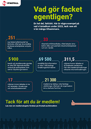 Skriv gärna ut affischen Vad gör facket egentligen? och sätt upp på din arbetsplats. Du kan även beställa den från IF Metalls webbshop (artikelnummer OF-200).