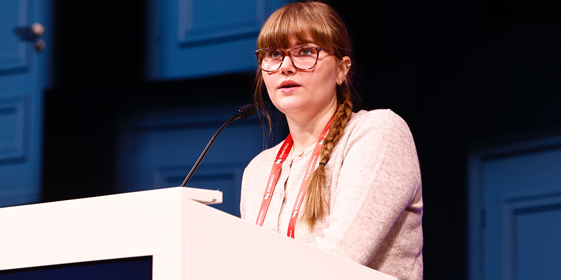 – Jag är det yngsta kongressombudet här, jag är 21 år gammal, men trots min unga ålder har jag redan hunnit kämpa i 7 år för att få hjälp av sjukvården. När jag till slut fick den hjälp jag behövde fick jag veta att jag har endometrios. Forskning visar att vi kvinnor i många fall inte får den vård vi behöver, och att våra symptom inte alltid tas på allvar. Det här leder till fördröjda diagnoser och behandlingar, vilket i sin tur påverkar vår hälsa och livskvalitet negativ. Låt oss tillsammans arbeta för att belysa den här viktiga frågan, och kämpa för jämställd vård. Och kanske, när vi har lyckats, så slipper en annan ung tjej vänta i sju år för att få vård.
