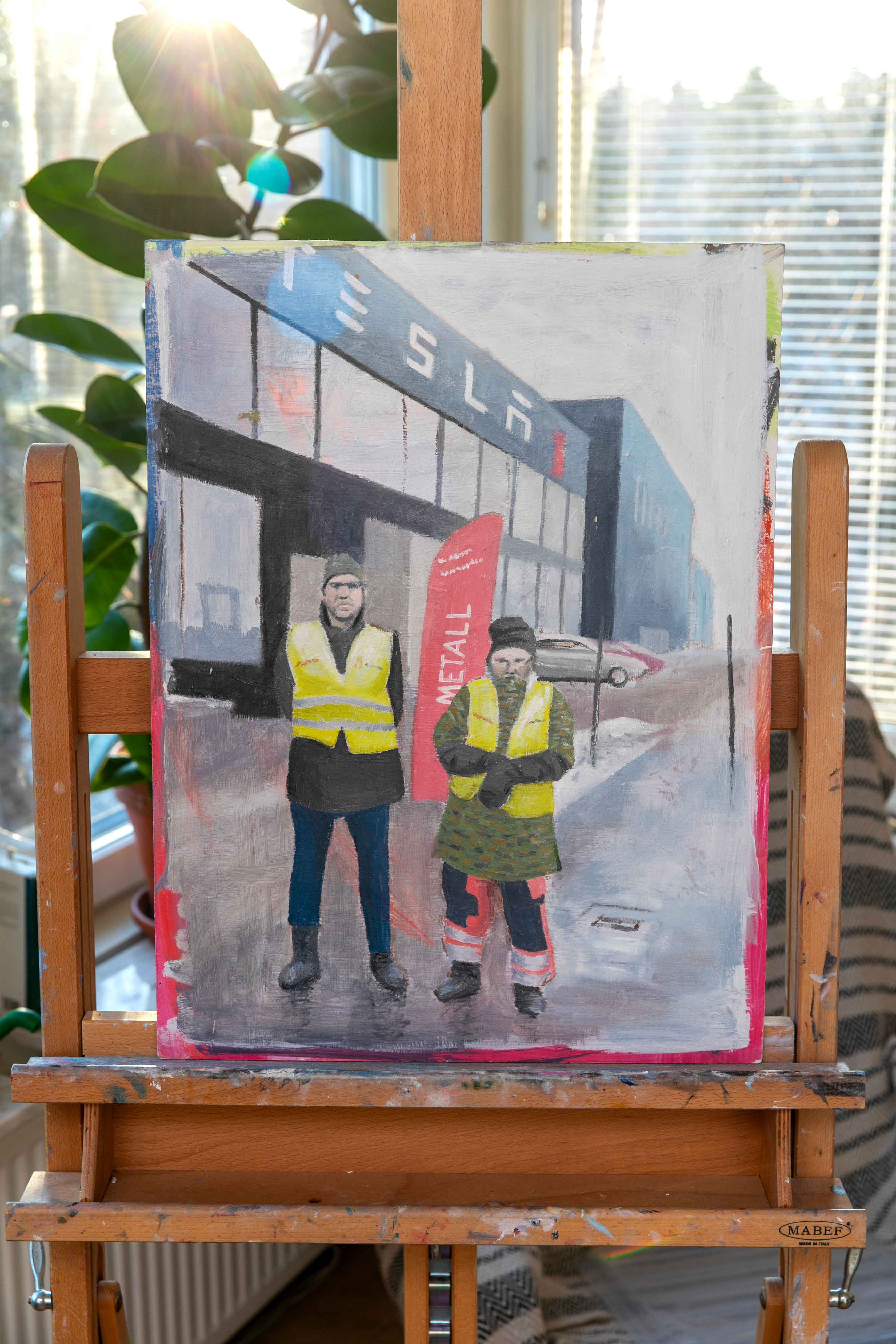 Under den långa strejken på Tesla har IF Metalls avdelningar fått fin uppbackning av andra fackförbund. I Uppsala har till exempel Kommunal ställt upp och stöttat med strejkvakter. En av dessa är Anders Alm, ordförande för sektion Uppsala Service-Teknik. Han är också en duktig målare och har målat flera tavlor med miljöer från strejken.