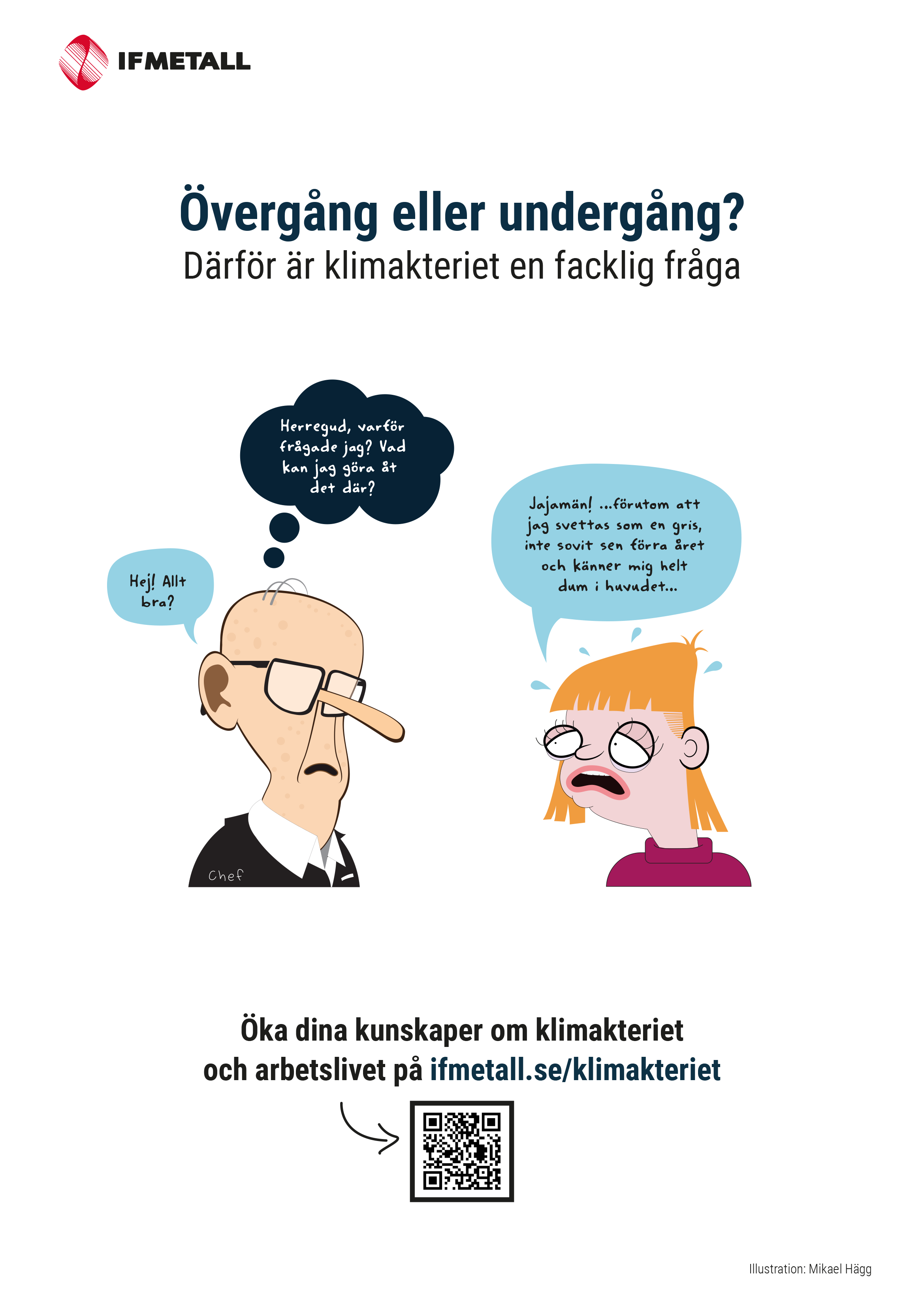 Den som har klimakterierelaterade besvär kan inte bestämma sig för att lämna dem hemma. Hur vi mår påverkar oss på arbetet, vår arbetsmiljö och våra arbetskamrater. Därför är det självklart för oss i IF Metall att klimakteriet är en facklig fråga. Den här broschyren riktar sig både till dig som söker stöd för dig själv, är anhörig och till dig som är fackligt aktiv. Broschyren finns även att beställa i IF Metalls webbshop, artikelnummer AA-223.