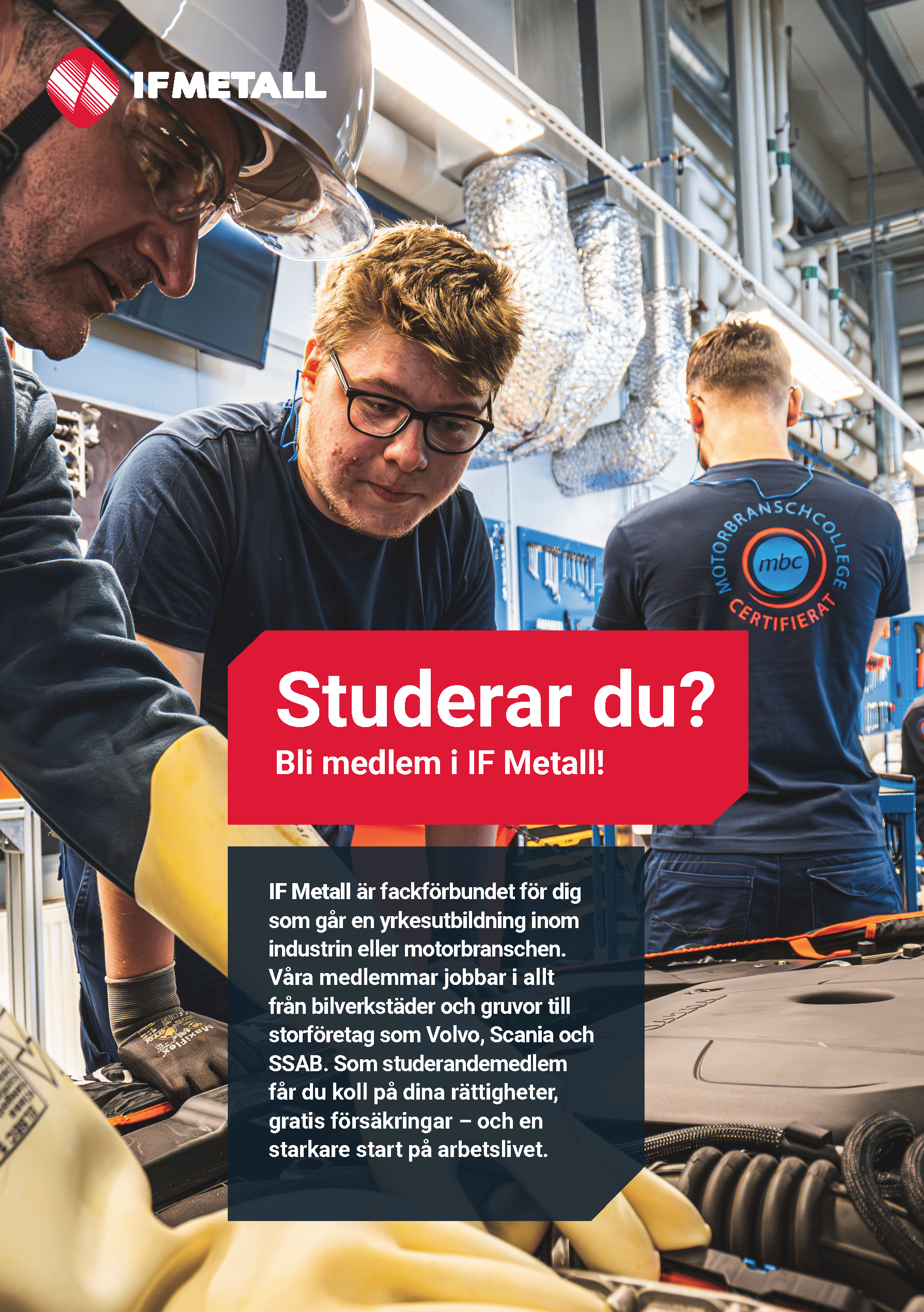 Studerar du på gymnasiet med en inriktning inom industrin eller motorbranschen? Bli medlem i IF Metall – det är gratis och försäkringar och andra förmåner ingår. Gäller även om du jobbar extra på helger eller lov.