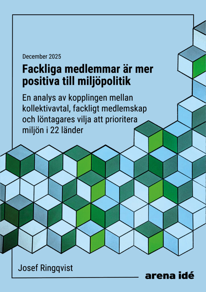 2026-01-09. Tankesmedjan Arena idé har gjort en analys av kopplingen mellan kollektivavtal, fackligt medlemskap och löntagares vilja att prioritera miljön i 22 länder. Resultaten visar att fackliga medlemmar generellt är mer benägna att värna om miljön än ickemedlemmar. Studien visar också att både medlemmar och ickemedlemmar i länder med högre kollektivavtalstäckning tenderar att vara mer positivt inställda till att värna om miljön på bekostnad av arbetstillfällen och ekonomisk tillväxt.