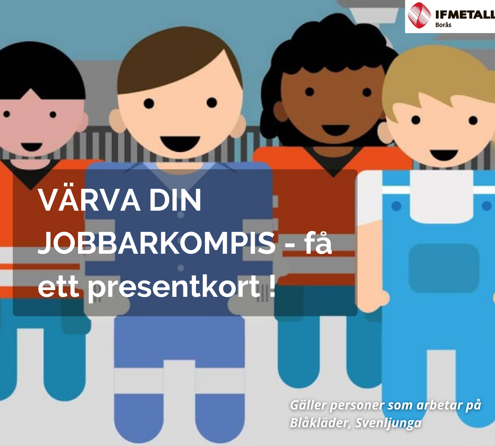 Hjälp till så vi blir fler! Berätta för dina jobbarkompisar på Blåkläder om varför det är viktigt att vara medlem i IF Metall. För varje person du värvar får du ett superpresentkort värt 200 kronor som tack. Självklart får även du som blir ny medlem ett superpresentkort värt 200 kronor. Och du, det finns inget stopp på hur många du får värva. Ju fler desto bättre - det är tillsammans som vi är starka!