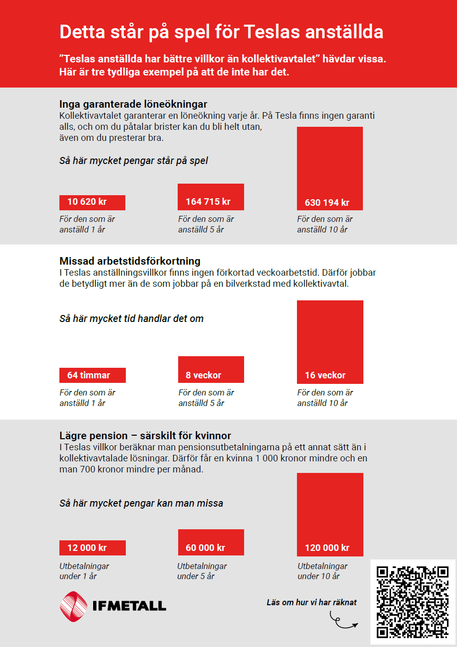Tesla vägrar kollektivavtal av ideologiska skäl, sägs det. Men det finns också stora ekonomiska skäl att inte garantera de anställda trygga och schyssta villkor. I dessa exempel har vi räknat på hur mycket en anställd kan förlora över tid på att Tesla inte har kollektivavtal.