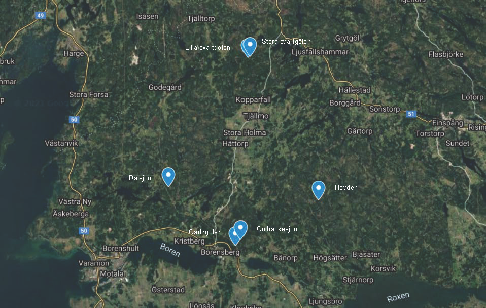 Vindskydd, grillplatser och bryggor finns vid samtliga sjöar. Två renodlade flugfiskesjöar finns, en ovanför Tjällmo och en utanför Borensberg. Övriga sjöar får man meta spinnfiska i. Naturen runt våra sjöar är fantastisk, här ges möjlighet till vandring i skog och mark. Svamp och bär brukar det vara gott om också.