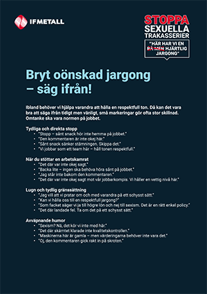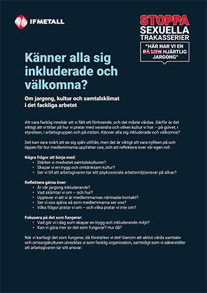 Sexuella trakasserier är ett omfattande problem i samhället, och arbetslivet är inget undantag – tvärtom. Sexuella trakasserier är dessutom mer vanligt förekommande inom industrin än på arbetsmarknaden i stort. Arbetsgivaren är skyldig att både förebygga och förhindra sexuella trakasserier på ett aktivt och organiserat sätt. Som förtroendevald i IF Metall ska du samverka med arbetsgivaren för att förhindra sexuella trakasserier, men du har också ett ansvar att föregå med gott exempel. Den här broschyren är tänkt som ett hjälpmedel för förtroendevalda i arbetet mot sexuella trakasserier.