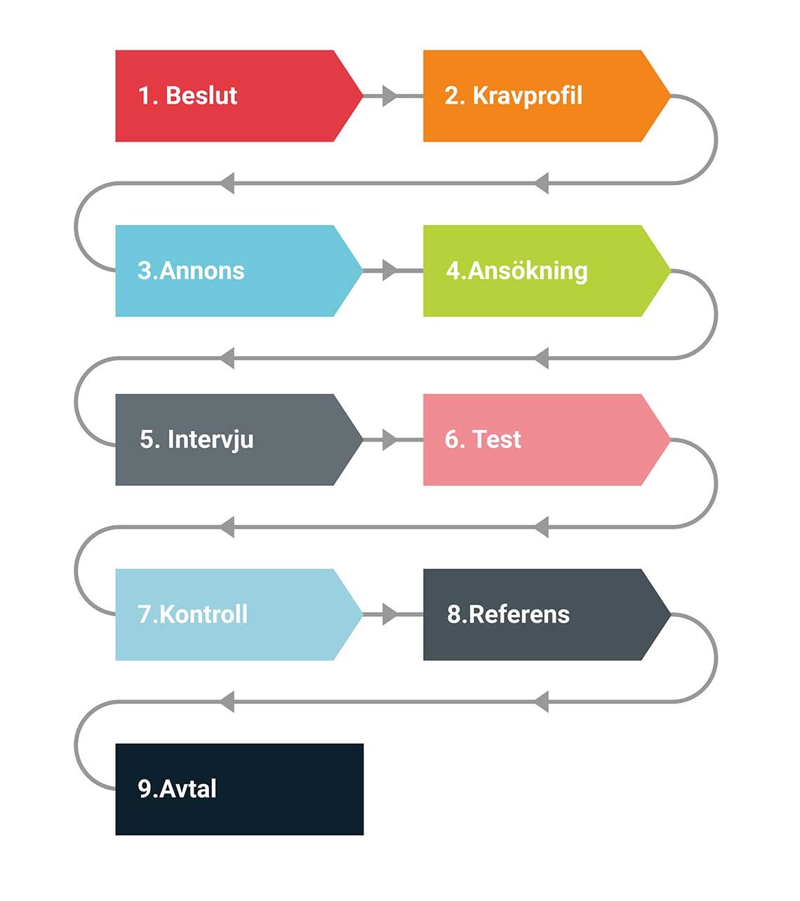 Rekryteringsprocessen består av nio steg som beskrivs nedan. Tillkommande ändamål och rättsliga grunder beskrivs i varje steg.