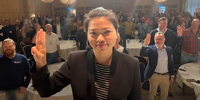 Nyligen besökte Khaing Zar Sverige för att prata om militärens förtryck. Hon är ordförande för Industrial Workers’ Federation of Myanmar (IWFM), men befann sig i Tyskland för studier när kuppen inträffade. Som läget är nu kan hon inte åka till sitt hemland.