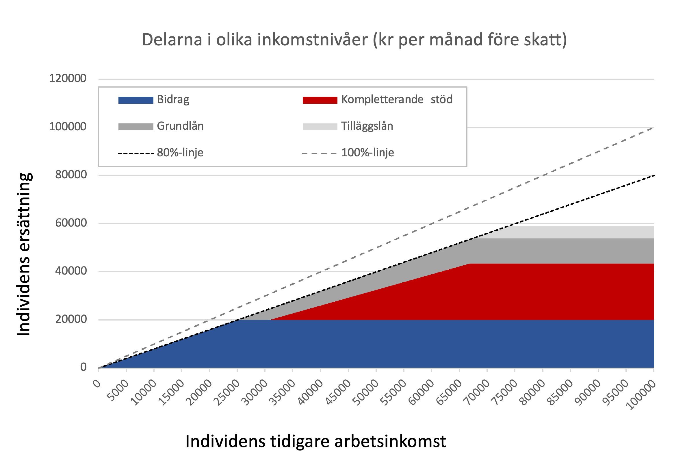 - Vid löner över det ersätts 65 procent av inkomsten upp till ett tak på 66.800 kronor.
