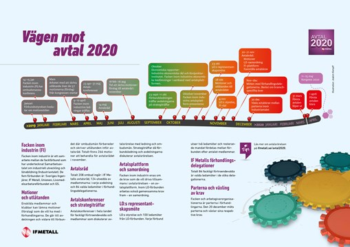 Redan under våren 2019 pågick arbete inför avtalsrörelsens förhandlingar. Nu under hösten 2019 blir arbetet allt mer intensivt för att kulminera under våren 2020. Vi har ritat en tidslinje – skriv gärna ut och sätt upp på anslagstavlan.
