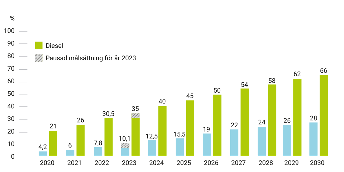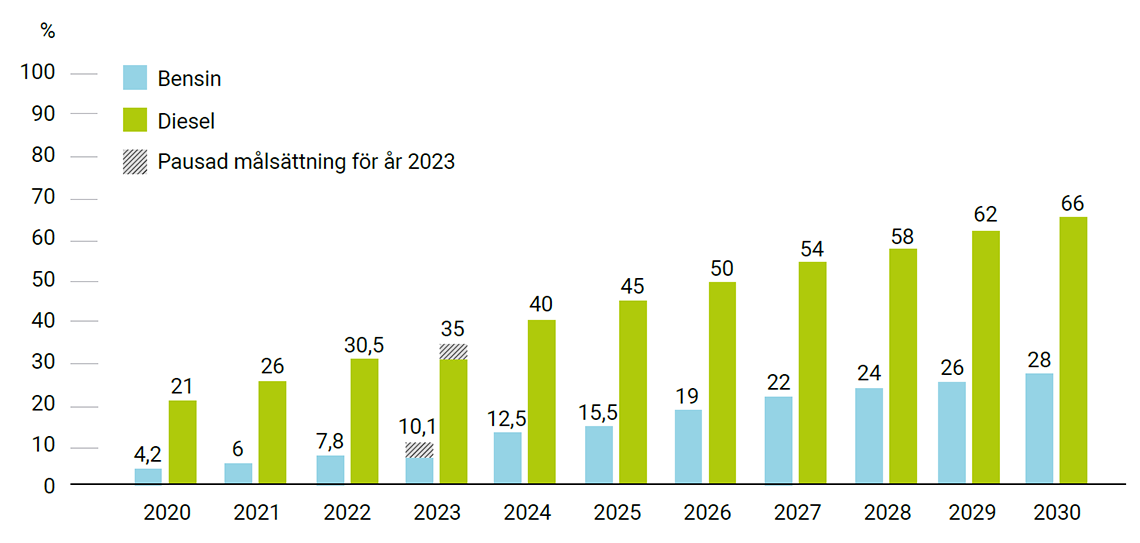 Det handlar alltså om det krav som drivmedelstillverkarna har på sig att blanda in en viss mängd biobränsle för att minska utsläppen av växthusgaser. Andelen ska öka varje år fram till 2030, men man gör nu ett avsteg från planen och pausar den tänkta ökningen för 2023. Vad innebär då det i praktiken?
